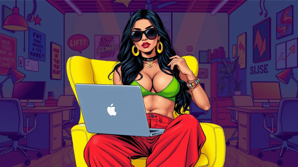 Her GTA San Andreas-style femme icons (electric green tops, fire-engine red pants) are a calculated middle finger to surveillance capitalism.